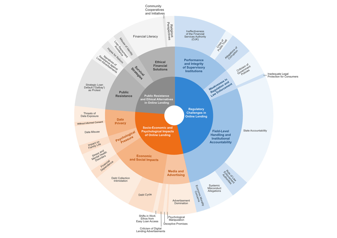 These themes indicate that public discourse frames online lending not only as a regulatory and legal issue but also as a social and psychological burden, while simultaneously generating narratives of resistance and alternative practices. Each theme is elaborated below.