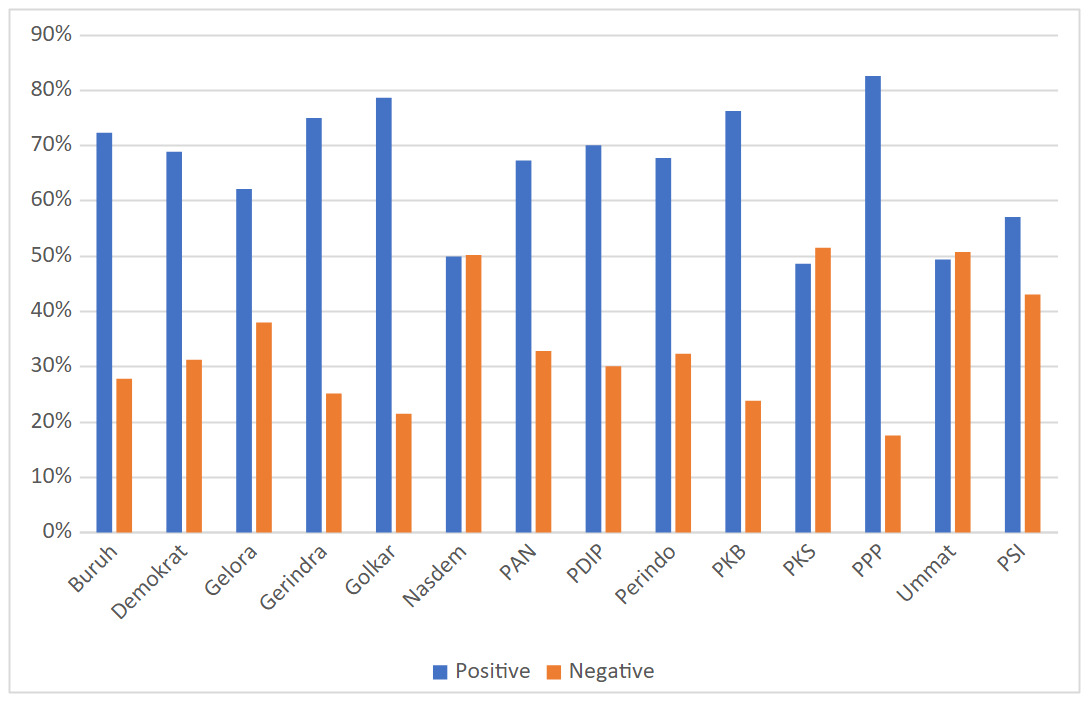 These results show the influence of presidential candidates, particularly Anies Baswedan, Prabowo Subianto, and Ganjar Pranowo, on party image, as well as the viral effect on social media. Positive sentiment towards these parties is likely driven by the support given to presidential candidates from parties such as the Demokrat, Nasdem, PDI, and Gerindra. This highlights the personalized nature of Indonesian politics, where figures often dominate party programs (Aspinall & Mietzner, 2019). This case is an example of how a figure can function as a node for party realignment and public debate. This development shows that personal charisma still plays a critical role in Indonesian politics, which has emerged since its democratic transition (Aspinall, 2015).