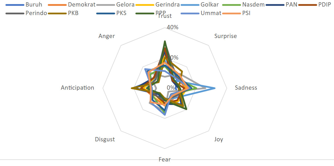 These emotion and sentiment patterns are important enough for political parties in crafting their communication strategy and positioning accordingly. Positive and high-trust sentiment parties, i.e., PPP and Gerindra, could keep or increase their positive image. At the same time, parties with negative sentiment problems or high negativity need to improve their image. This information shows the complex emotions in Indonesian politics as trust, positive surprises, and thoughtful management of negative perceptions are key for solid political party engagement with the public.