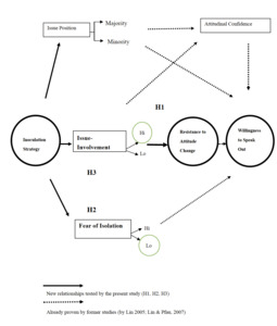 Research has left room open for other variables supporting the theoretical function of weaving the two theories, such as fear of isolation and issue involvement. These issues have been examined by the present study. Fear of isolation is negatively correlated with people’s willingness to speak out in public, whereas issue-involvement is not only an essential variable in inoculation but also an important concept to measure the hard core in the spiral of silence. The newly examined variables and relationships in the present study and those shown in previous studies are presented in Figure 1 using different types of arrows to represent their conceptual relationships.